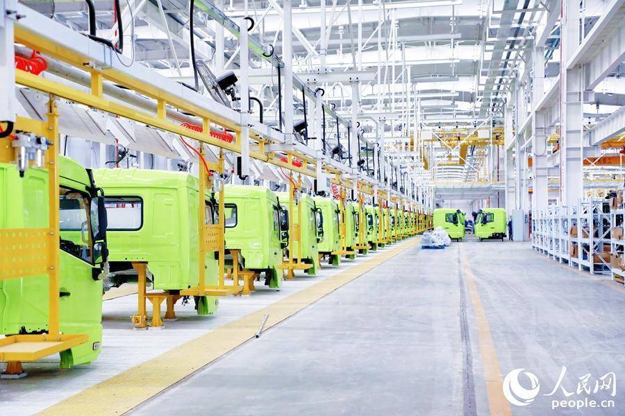 在位于宁德福安市的青拓重工生产车间内,新能源纯电动矿用运输车头依次排列在生产线上。人民网记者 李唯一摄