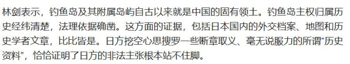 对此,中方外交部发言人表示,钓鱼岛及其附属岛屿自古以来就是中国的固有领土,日本绞尽脑汁拿出一些毫无说服力的历史资料,正说明了其非法主张根本站不住脚。