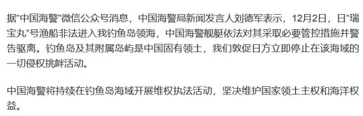 然而,日本并没有因此收敛,12月2日,其“瑞宝丸”号渔船如一个不速之客,公然非法闯入我国钓鱼岛领海,瞬间点燃紧张情绪,随后,中国海警依法采取必要管控措施并警告驱离。